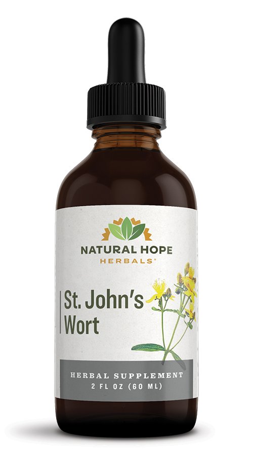 St. John’s wort’s sunny yellow flowers make a beautiful red herbal tincture used to support healthy nerves and relieve occasional sour stomach and mood.